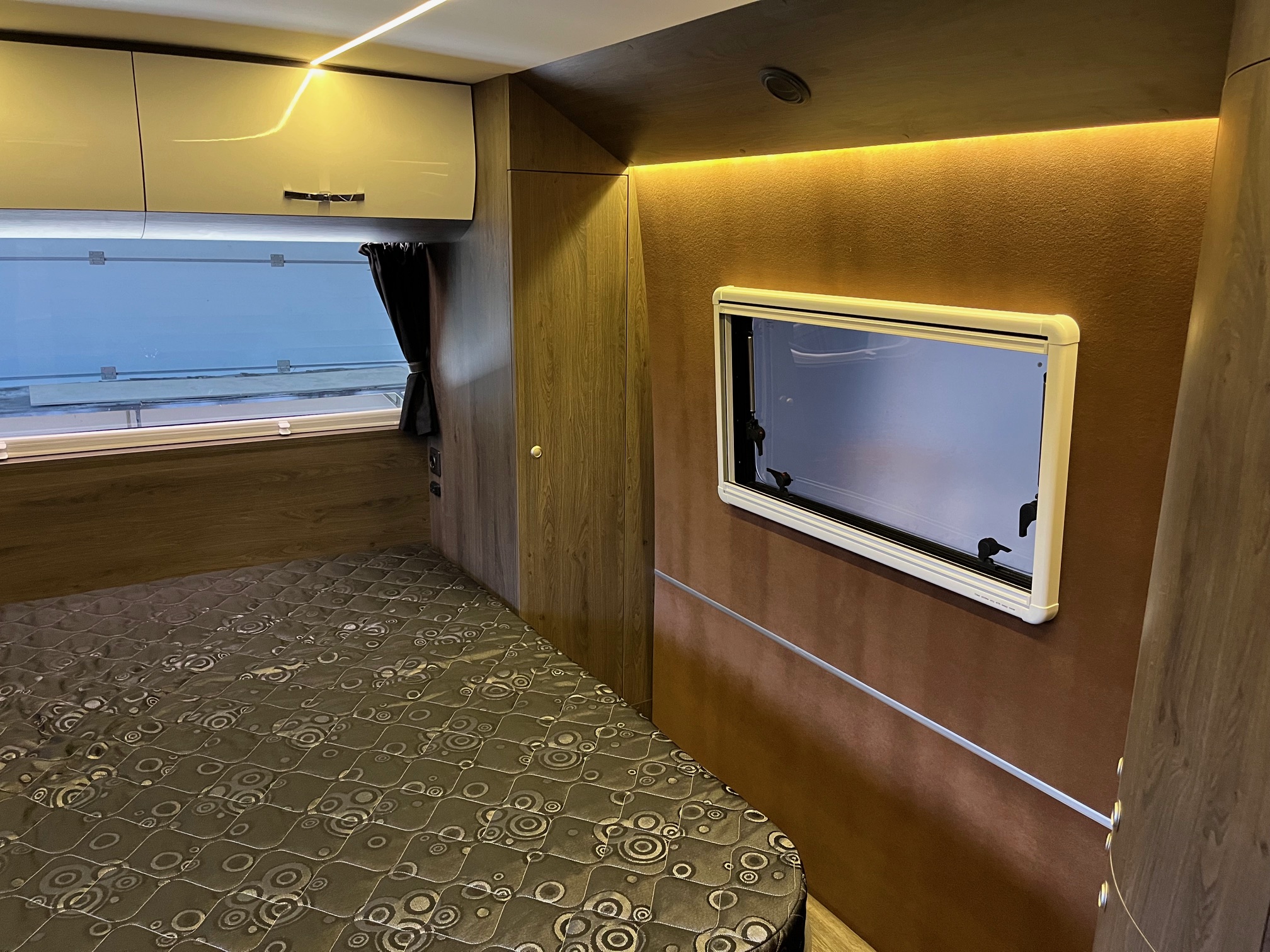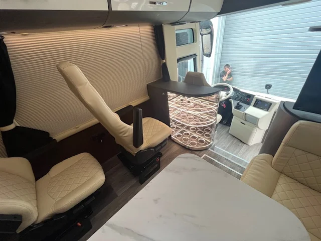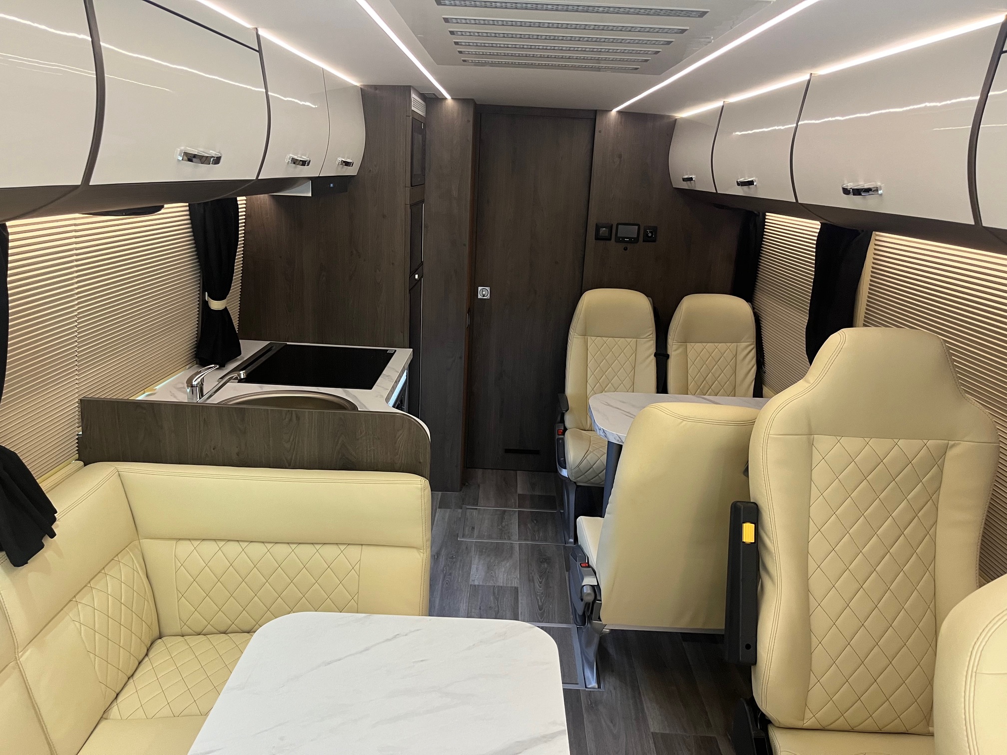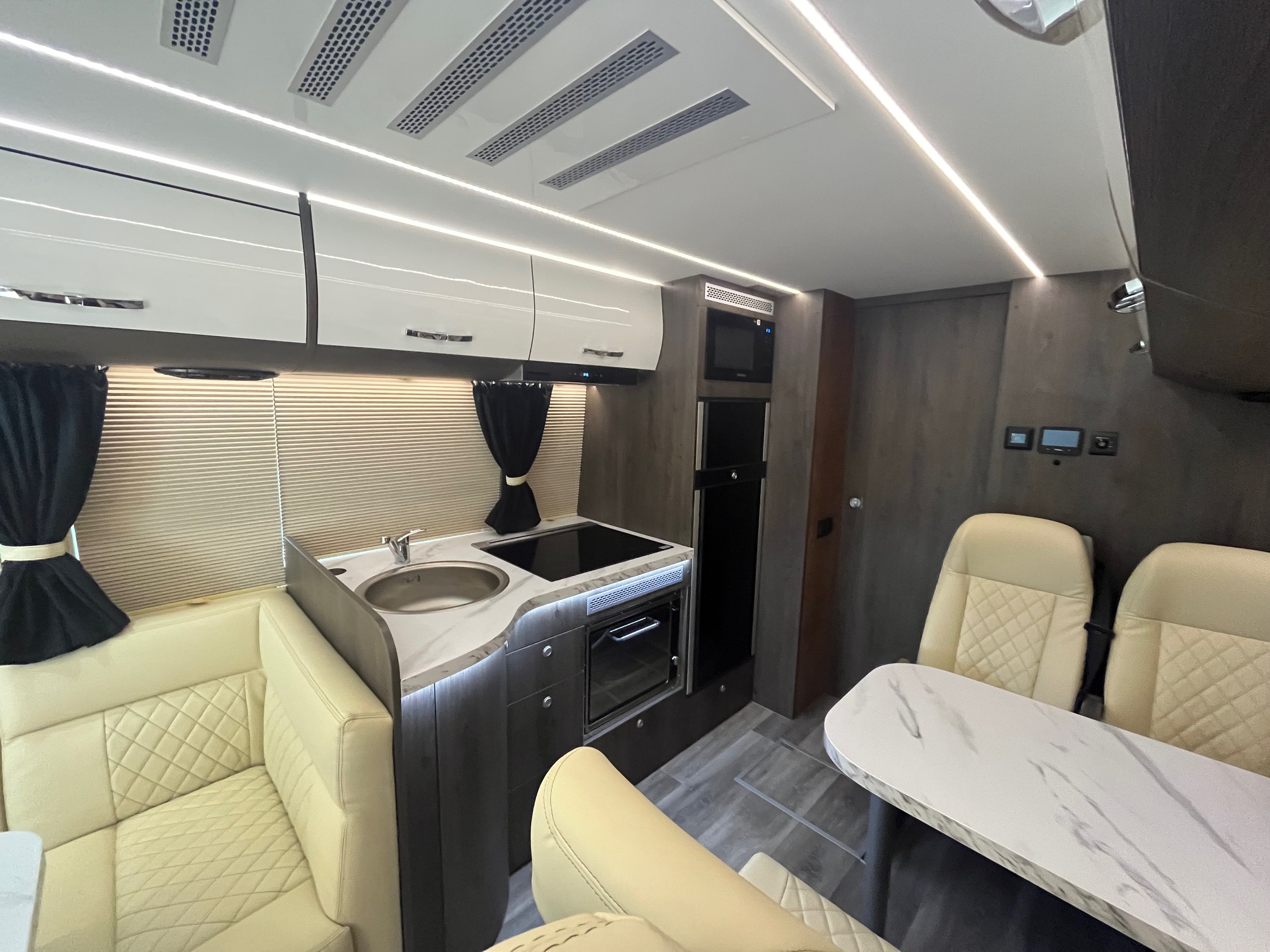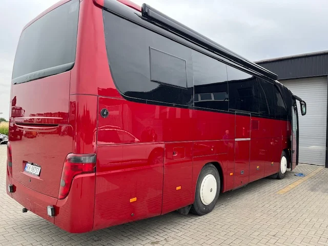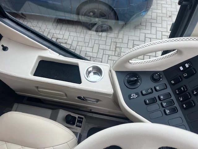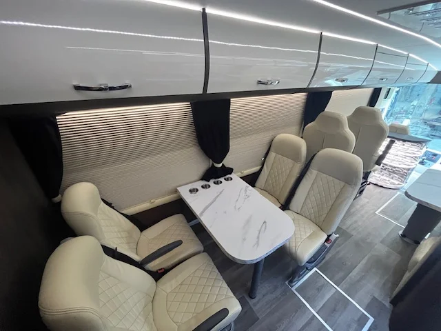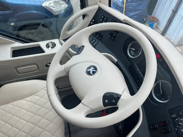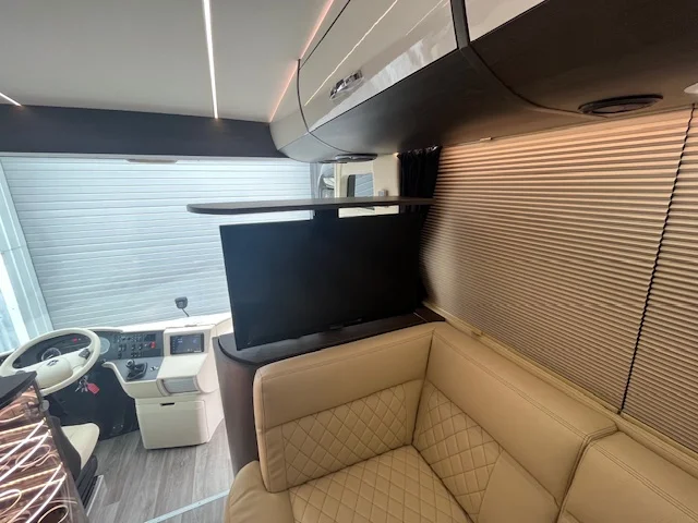SETRA 10 m. Puikus 10 metrų kemperis su šviesios spalvos interjeru, visiškai šviesos nepraleidžiančiomis žaliuzėmis ant langu, pakeliamu televizoriumi ir šviečiančiu baru gėrimams.