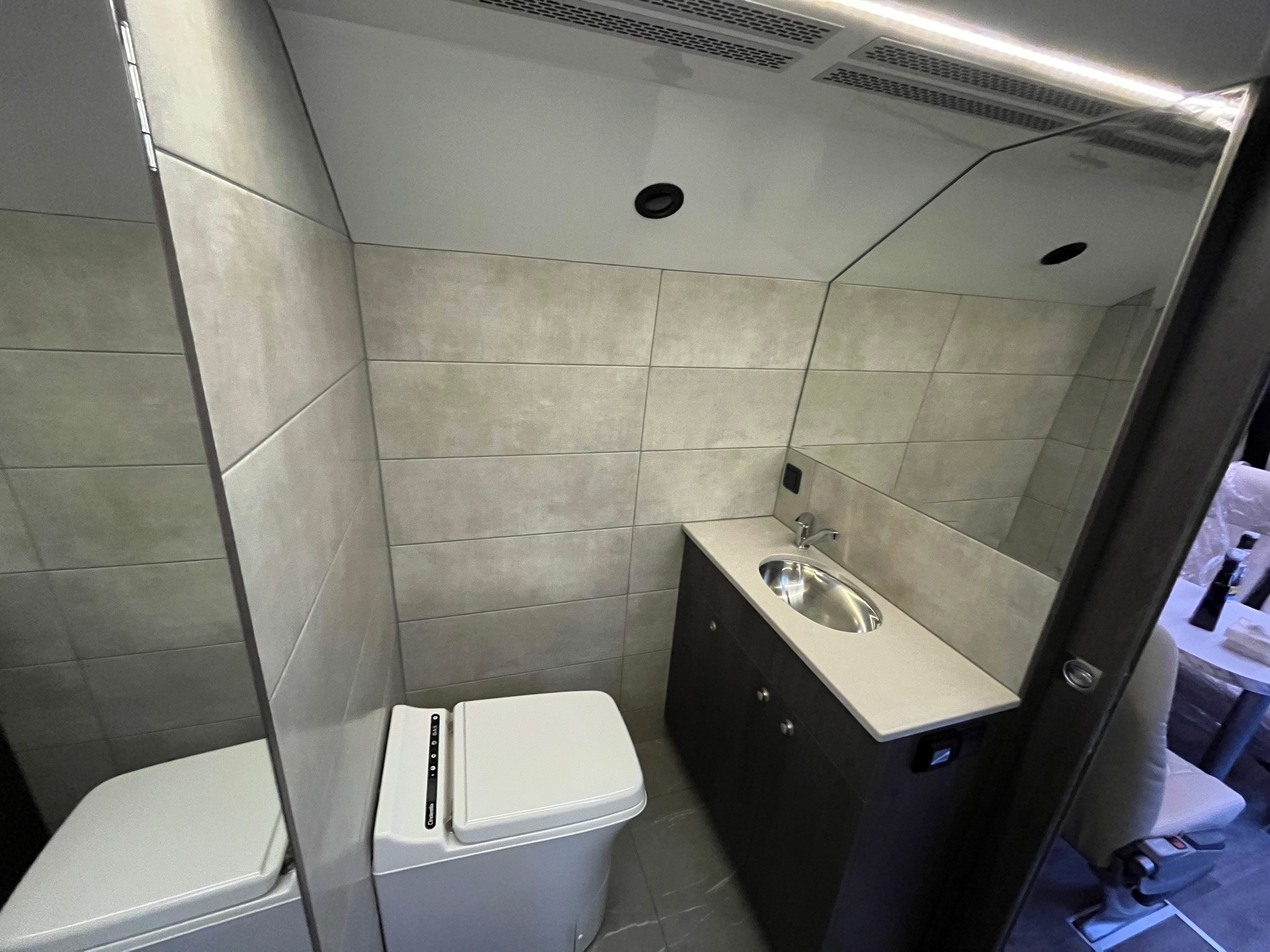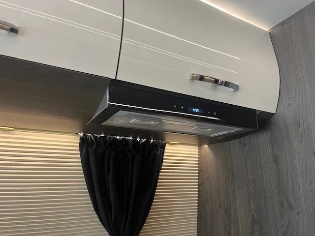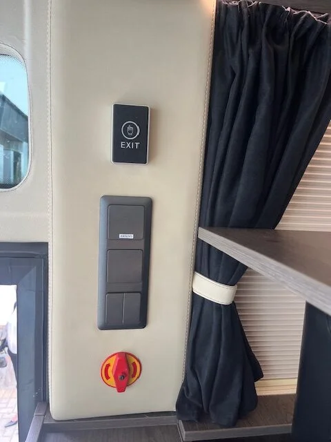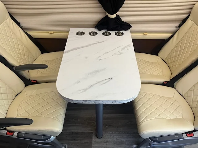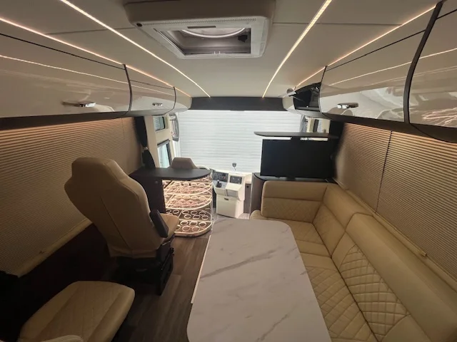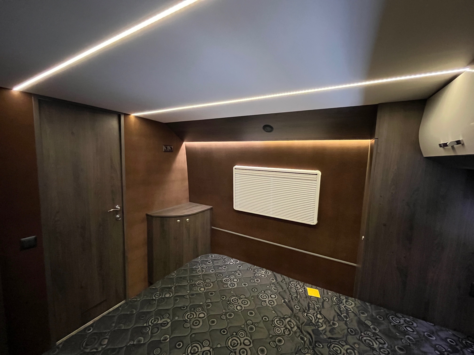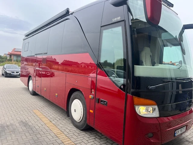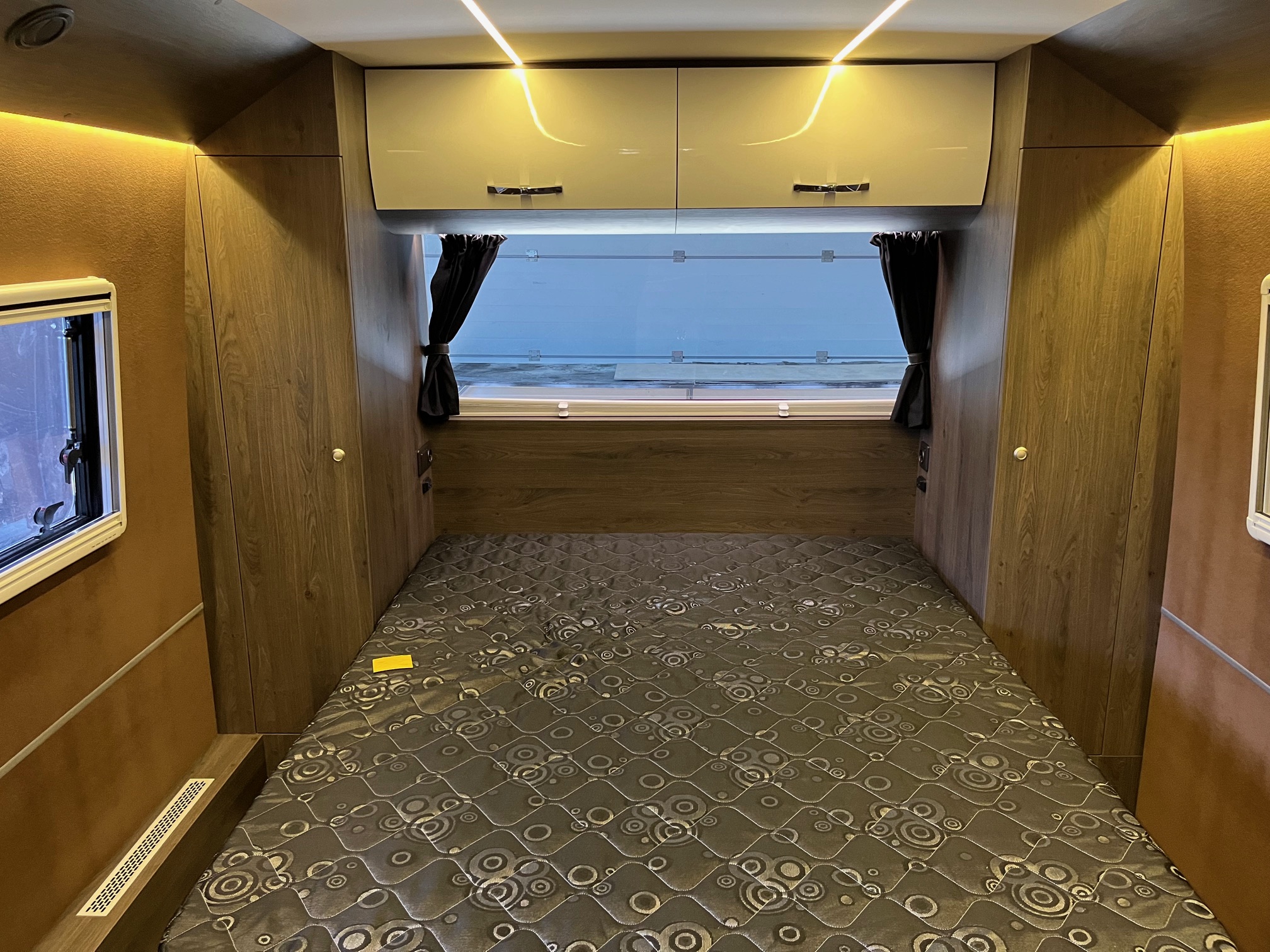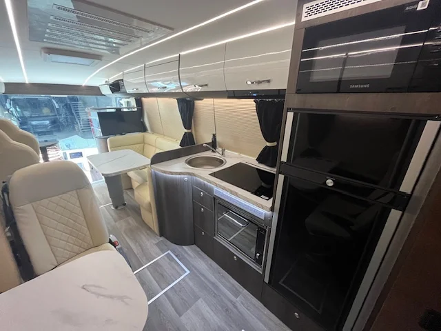 SETRA 10 m. Puikus 10 metrų kemperis su šviesios spalvos interjeru, visiškai šviesos nepraleidžiančiomis žaliuzėmis ant langu, pakeliamu televizoriumi ir šviečiančiu baru gėrimams.