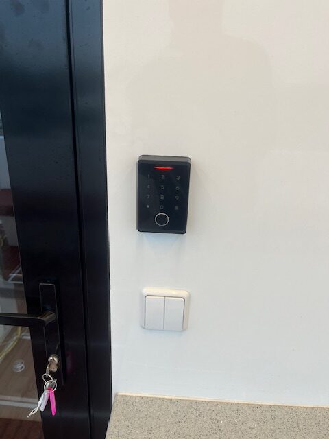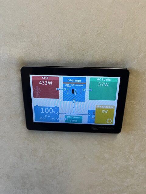 „Victron“ elektros sistema su 230V tinklu, 12V AGM baterijų bloku ir saulės baterijomis