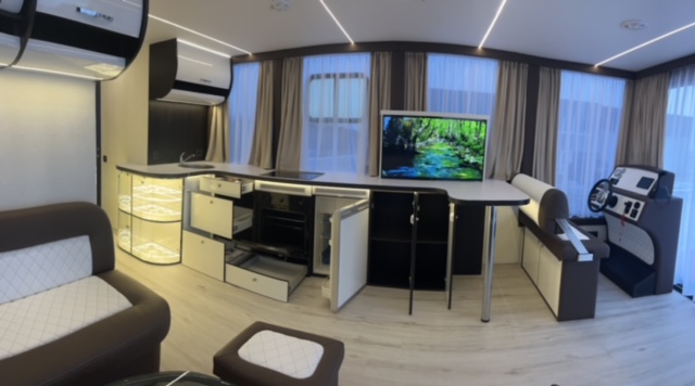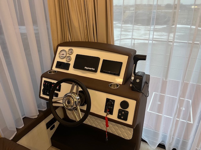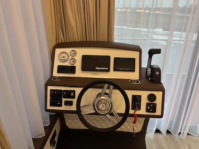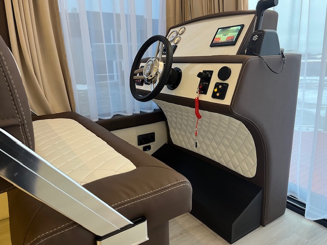 Vairuotojo vieta su hidrauliniu vairavimu, prietaisų skydeliu, vairo rankena ir techninės įrangos valdymo pultais